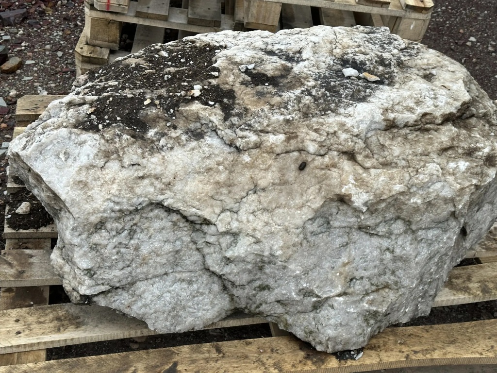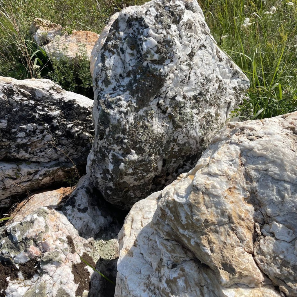 Цвет валунов: белый, при ближайшем рассмотрении видна кристаллическая структура кварца с небольшим количеством вкраплений.